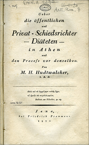 | Ant.Rom. 0007 Ueber die öffentlichen und Privat-Schiedsrichter Diäteten in Athen und den Process vor denselben. Von M. H. Hudtwalcker, b. R. D. - Jena : bei Friedrich Frommann, 1812. XIV, 183, [1] p. ; 8°. il frontespizio |