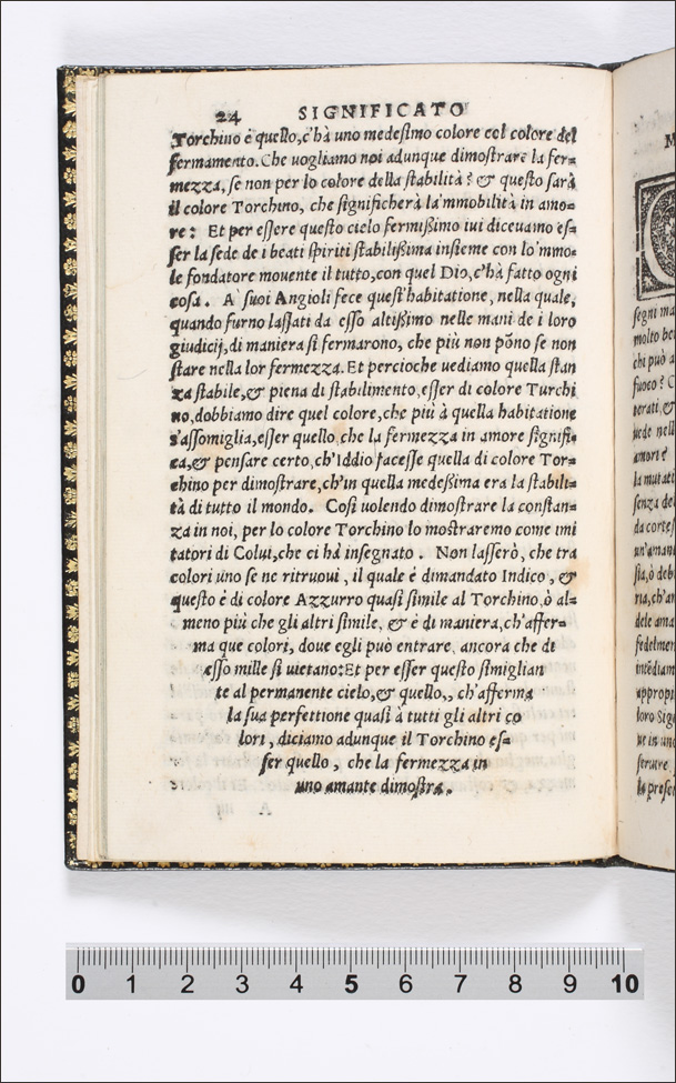 Il colore incarnato significa Amore. Cap. I. (p. 9-13); Il verde speranza. Cap. II. (p. 13-15); Il negro fede. Cap. III. (p. 15-18); Il bianco secreto. Cap. IIII. (p. 19-21); Turchino fermezza. Cap. V. (p. 22-24); Morello. Timore. Cap. VI. (p. 25-27); Berettino disperatione. Cap. VII. (p. 28-31); Rosso crudeltà. Cap. VIII. (p. 32-37); Giallo superbia. cap. VIIII. (p. 37-40); Verde sambugato uoglia di morire. Cap. X. (p. 41-43); Ranzato gelosia. Cap. XI. (p. 43-47); Meschio leggerezza. Cap. XII. (p. 47-50); Rosa secca amore finito. cap. XIII. (p. 50-54); Tanè, o leonato, tradimento, et inganno. Cap. XIIII. (p. 55-60) |