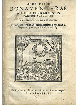 La vignetta che figura sul frontespizio e in fine del De die non la si è incontrata, almeno finora, su nessun altro libro stampato dai Gadaldini, né su altre opere di Bonaventura Angeli. Nel testo dell'opuscolo non troviamo niente che possa in qualche modo spiegare quest'immagine. L'operina di Angeli, come riferisce Barotti, II, p. 187, nella voce delle Memorie istoriche di letterati feraresi a lui dedicata, tratta "del giorno naturale, e dell'artificiale rispettivamente agli usi forensi". Niente a che vedere, almeno apparentemente, con le figure della nostra vignetta.