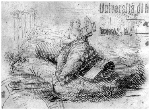 Fondo antico - Immagini della Giustizia: riquadri e medaglioni incisi: la Giustizia e le colonne