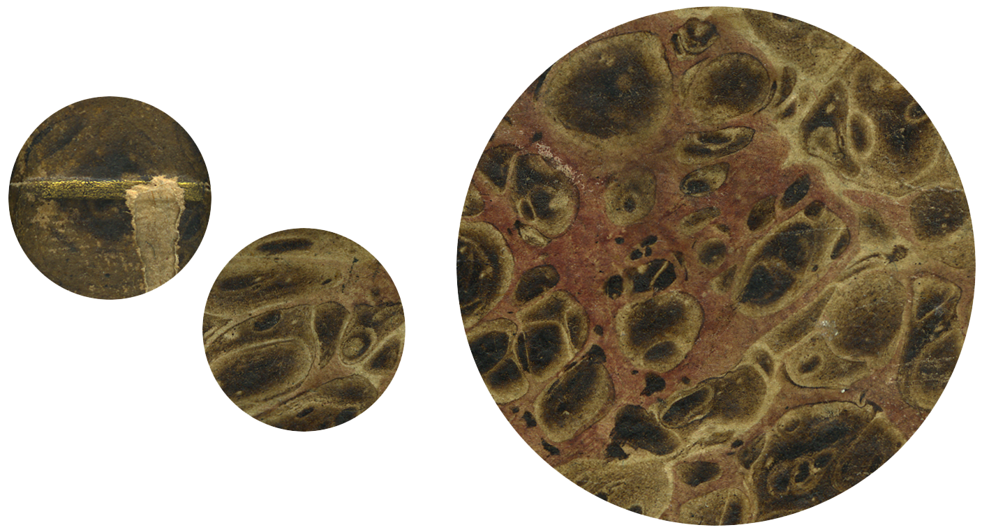 su tassello nero in pelle. Sui piatti carta marmorizzata del tipo a conchiglia o shell pattern in diverse tonalità di marrone e nocciola con venature rosa