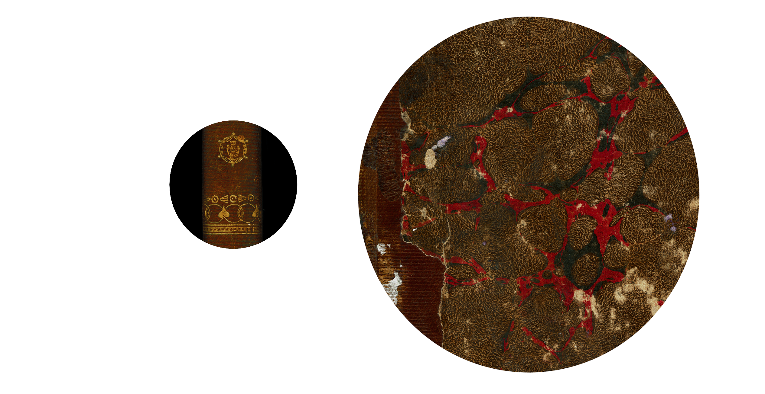 Legatura coeva in mezza pelle marrone e carta decorata su cartone (mm 216 x 133 x 15); dorso liscio; finti capitelli. Dorso decorato in oro, suddiviso in sei compartimenti da tre rotelle ripetute (fascetta stellata con due filetti semplici ai margini, cerchietti intrecciati con foglie a cuore, fascetta con piccolo cerchio e sui lati fiocchi disposti simmetricamente): autore e titolo al secondo compartimento, piccolo ferro circolare con civetta al terzo e al quinto, piccolo ferro ovale con fiore al primo, quarto e sesto compartimento. Sui piatti carta marmorizzata del tipo romantico (o marbres cassés) a chiazze macchiettate in marrone scuro e nocciola su fondo nero, con venature rosse.