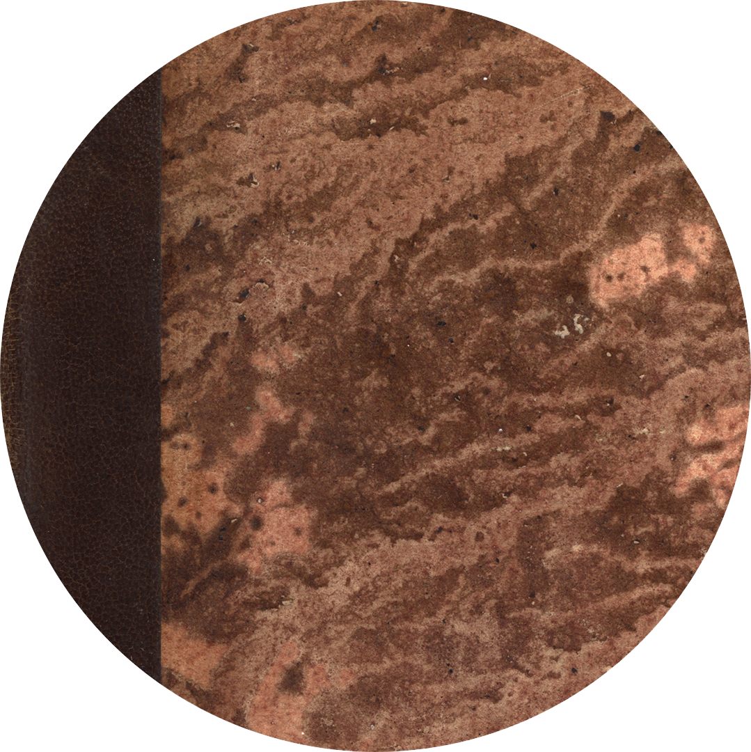 da un secondo filetto in testa e al piede, contenente una seconda cornicetta ovoidale con autore e titolo nella zona di testa, nella parte sottostante ripetuto tre volte grande ferro fitoforme a nastro. Sui piatti carta a colla, papier coulé, con scolature di colore cipria su fondo grigio marrone. Tagli spruzzati in blu.