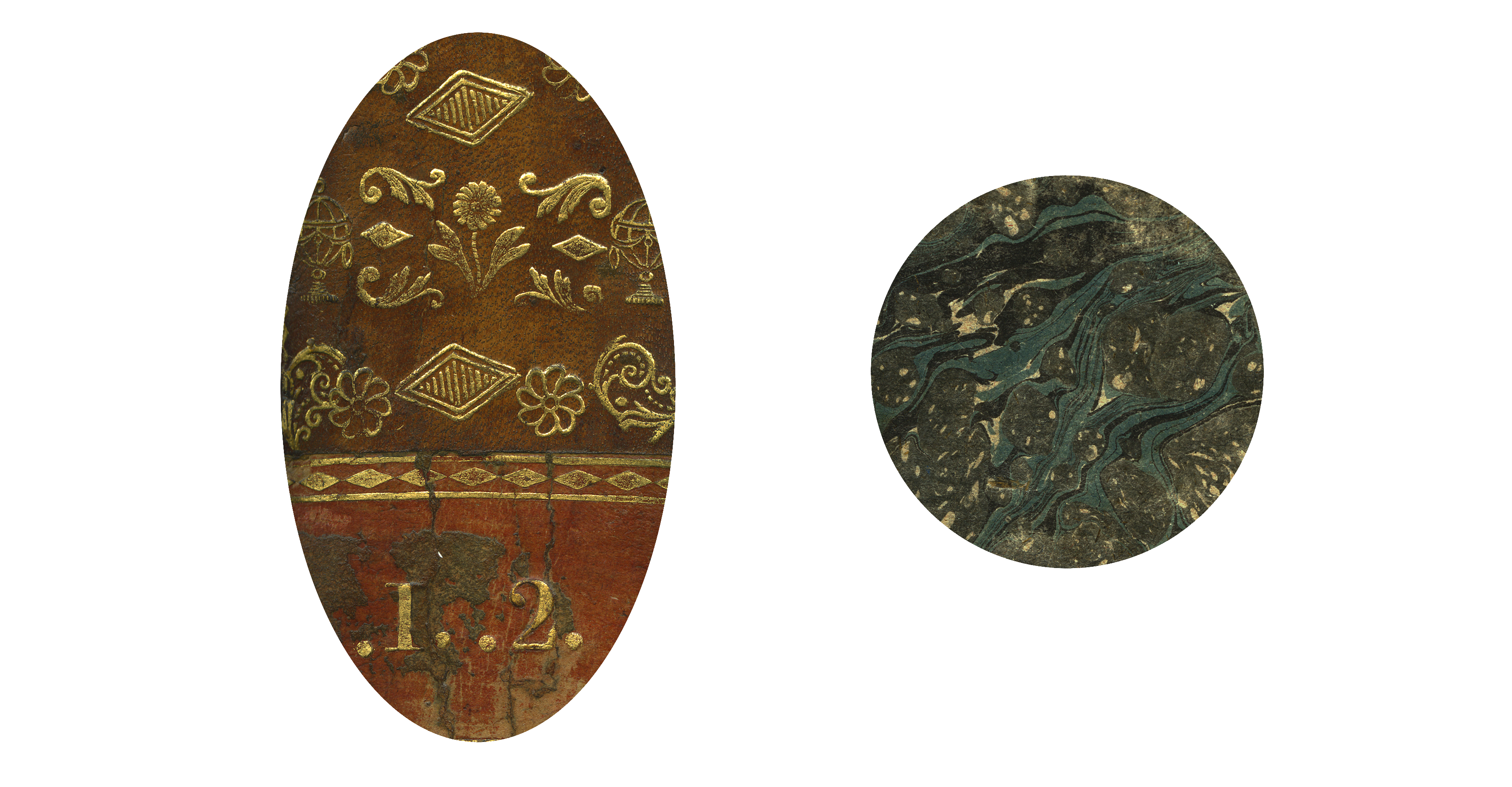 Legatura di inizio XIX secolo in mezza pelle marrone e carta decorata su cartone (mm 210 x 134 x 42) comprendente entrambi i volumi; dorso liscio su tre nervi; finti capitelli. Al dorso cinque compartimenti con decorazione in oro delimitati da doppio filetto con all'interno motivo a rombi: su tasselli rossi in pelle autore e titolo al secondo compartimento, numerazione al quarto; negli altri compartimenti piccoli ferri ripetuti: foglia e fiore composti in una serie di fasce orizzontali al primo e al quinto compartimento; al terzo disposti a specchio intorno ad un fiore centrale altri sei elementi (altro fiore, due motivi a foglia, due diversi motivi a forma romboidale, mappamondo); al piede del quinto compartimento iniziali: "P. S.". Sui piatti carta marmorizzata del tipo Stormont o Empire con venature in verde (o blu pavone) e nero su fondo grigio e bianco.