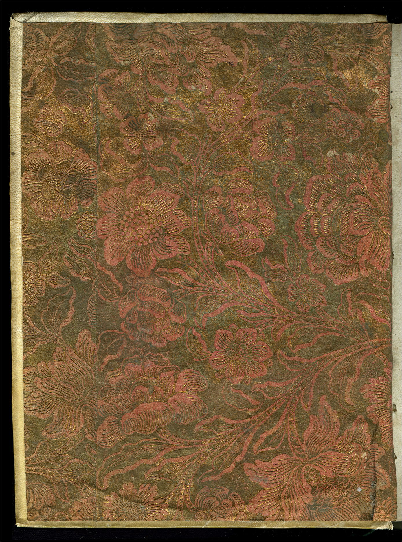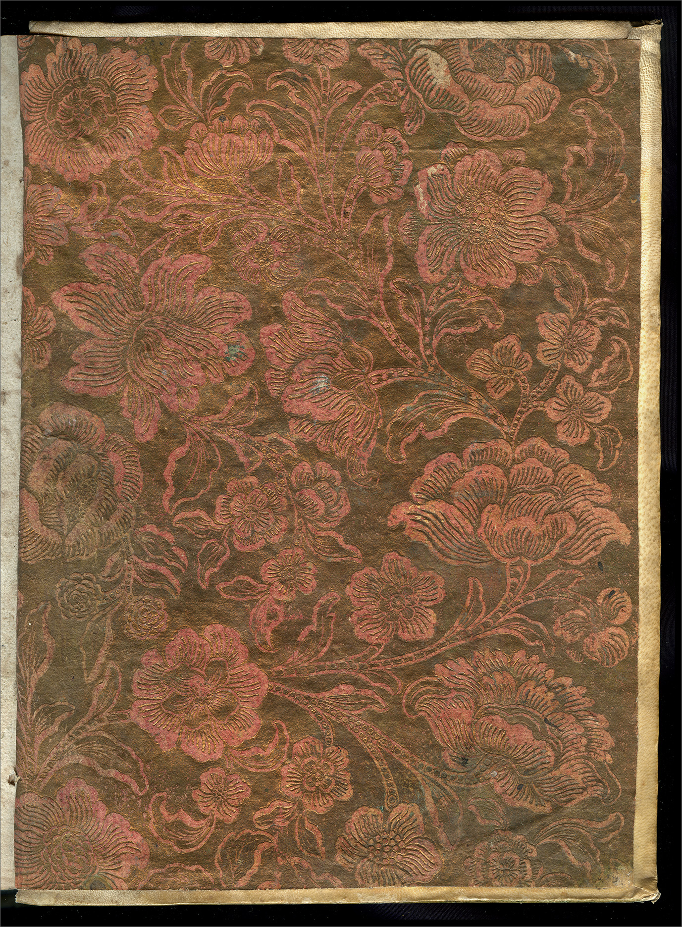La carta colorata in rosa, dorata e goffrata, con motivi floreali, che copre i due contropiatti della legatura settecentesca in pergamena.