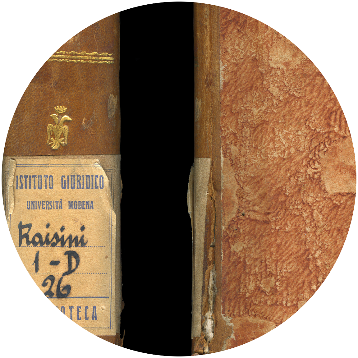 Legatura coeva in mezza pelle e carta decorata su cartone (mm 239 x 193 x 32); dorso liscio su tre nervi; finti capitelli. Decorazione in oro sulla pelle marone chiaro del dorso: tripli filetti lo suddividono in 6 compartimenti con autore e titolo su fondo verde al secondo,