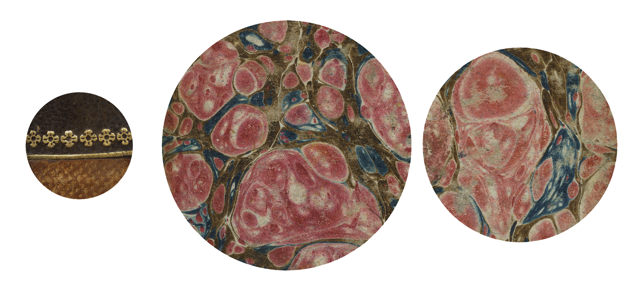 Legatura della metà del XIX secolo in mezza pelle e carta decorata su cartone, con angoli (mm 197 x 131 x 20); dorso liscio su tre nervi; senza capitelli. Il dorso è decorato in oro, diviso in cinque compartimenti da rotella con motivo fitomorfo e tassello nero in pelle con autore, titolo e filetto semplice accompagnato da quadrifogli. Sui piatti carta marmorizzata del tipo a conchiglia o shell pattern, in rosa blu e marrone su bianco. Rosso vermiglione gli angoli in pelle; tagli spruzzati in blu.