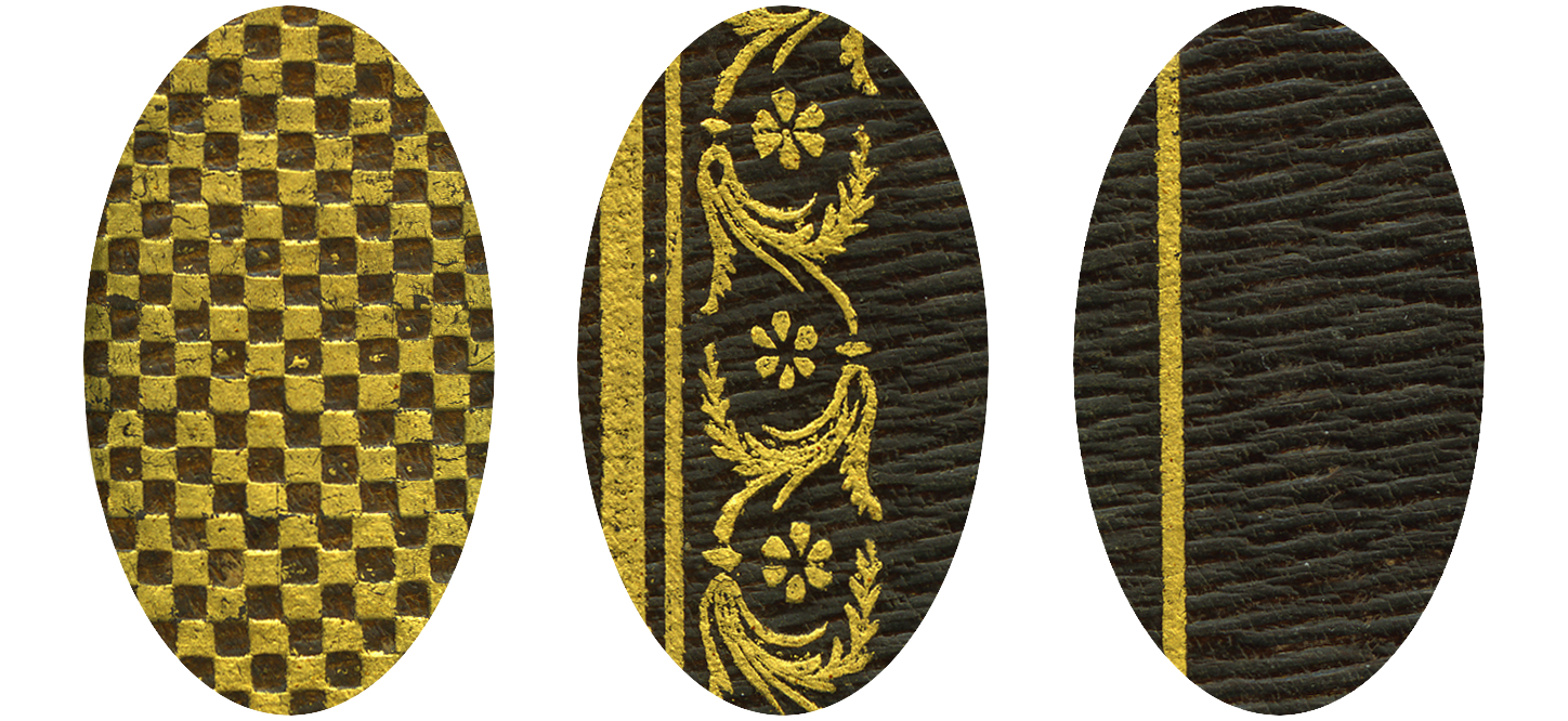 Legatura di inizio XIX secolo in piena pella zigrinata di colore marrone decorata in oro (mm 215 x 136 x 22); dorso liscio su tre nervi; capitelli verdi e nocciola. Ai piatti cornice esterna di doppi filetti circoscrive motivo fitomorfo a rotella con foglie e fiore a sei petali; più all'interno cornice di filetti semplici con anellino ai quattro angoli. Sul dorso filetti semplici o doppi delimitano sei compartimenti: motivo a scacchiera al primo, terzo e quinto; titolo al secondo e numerazione del volume al quarto compartimento; motivo ornamentale nel compartimento di piede. Labbro decorato con filetto semplice. Controguardie e guardie in tessuto bianco marezzato: sull'unghiatura dentelle con motivo a catena; immediatamente all'interno, sul tessuto, altro motivo a rotella in oro con rose, loro foglie e boccioli. Tagli dorati.